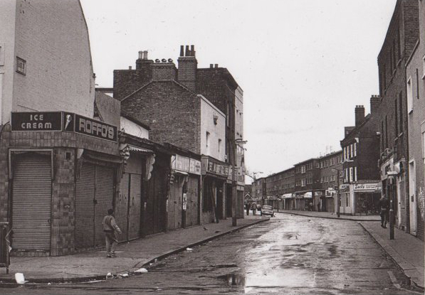 In the picture below, which I’d date early to mid 80s (and is how it still exists in my mind’s eye), it’s easy to see the pavement on the right being interrupted by a side street. Not so easy to notice are the overhanging lights on the building this side of the corner. They belonged to a pub. Looking at ‘street view’ today, it’s a grocers. The current layout would never suggest in a million that a roaring boozer was once there.