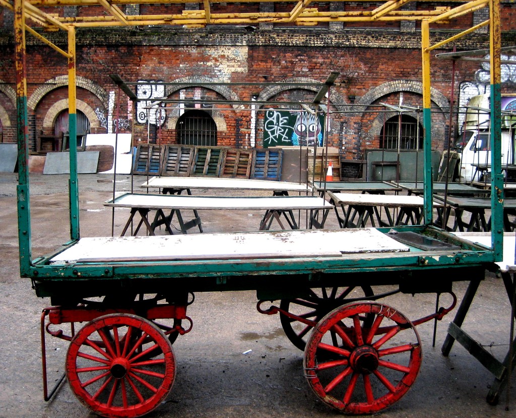 T would jump out the motor to go find the manager, while I tried to find parking near to the market as possible; from there a barrow (picture from Spitalfields) to get everything to the pitch.